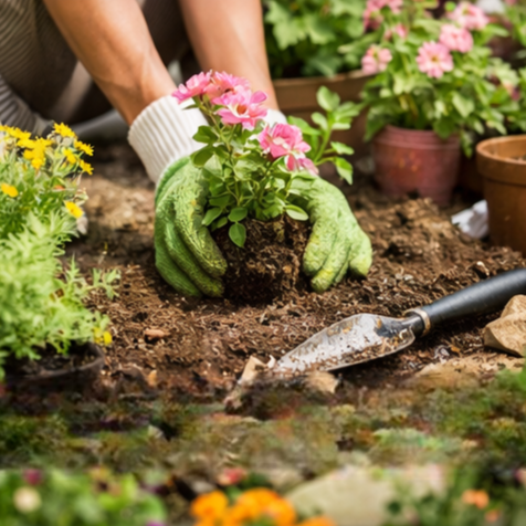 Removal of unwanted weeds and planting of flowers, shrubs, and other plants.